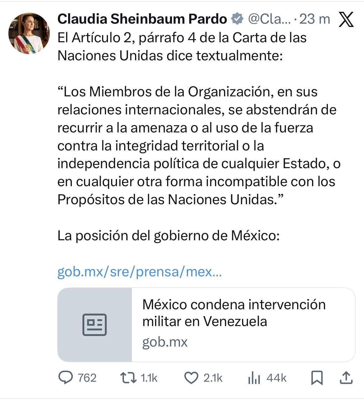 Claudia Sheinbaum se pronunció hace unos minutos: ante los reportes sobre la captura de Nicolás Maduro en Venezuela, reiteró en X que México rechaza el uso de la fuerza, citó el Art. 2(4) de la Carta de la ONU y compartió el comunicado de la SRE que condena la intervención militar y llama a una salida diplomática.