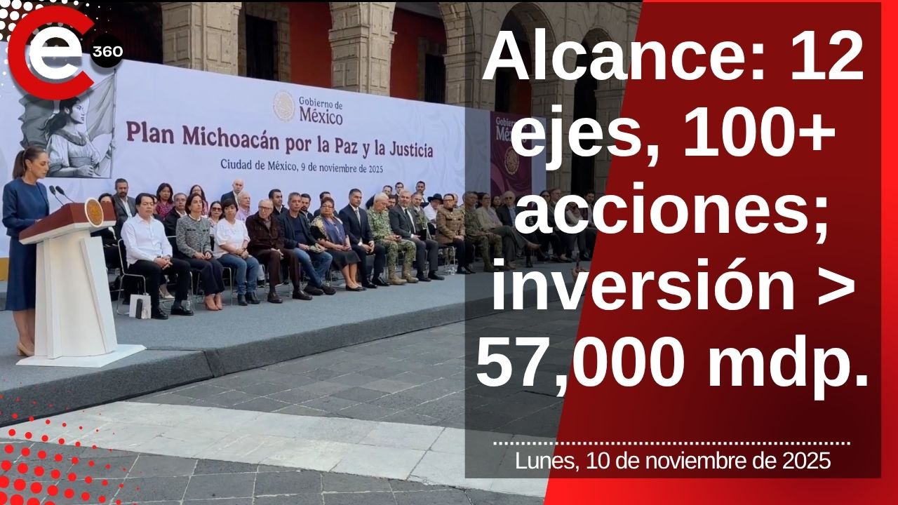 La presidenta Claudia Sheinbaum presenta en Palacio Nacional el Plan Michoacán por la Paz y la Justicia, una estrategia de 12 ejes con más de 100 acciones y una inversión estimada superior a 57 mil millones de pesos. El dispositivo combina programas sociales y de desarrollo con un refuerzo de seguridad e inteligencia orientado a municipios de mayor incidencia.